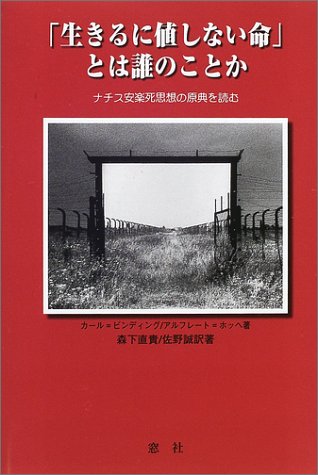 【書評】ビディング/ホッヘ『「生きるに値しない命」とはだれのことか』 森下直貴・佐野誠訳、窓社、二〇〇一年一一月 一九二〇年の第一次世界大戦敗戦後のドイツで、法律家と医者が共同研究を行って安楽死の法的な解禁を求めた書物。とくに医者のホッヘは、治療不能な精神病患者は「どんな場合であれ、死が優先されるべき」(70)と主張する。そして重度の知的障害者をとくに生きるに値しない「物」Dingと決めつけ、「誰にとっても最も重荷となる連中(Existenz)」として切り捨てようとする(77)。…書評の続きはこちらに。